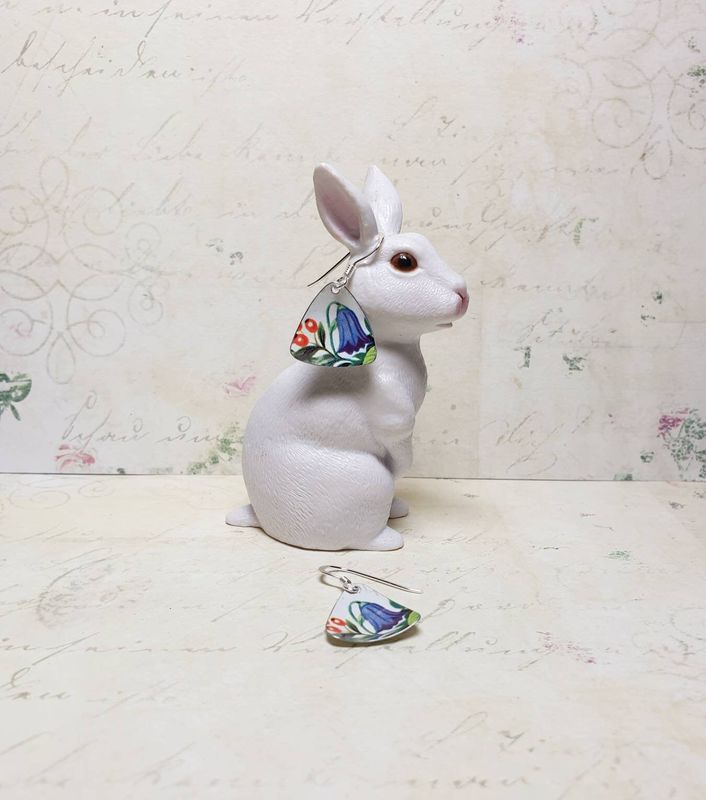 Bright flowers on these simple triangle earrings, hand cut from a 1963 "Grace" biscuit tin made by Huntley and Palmer, hung on .925 sterling silver earwires*