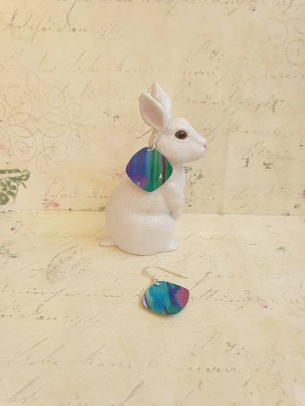 Design will vary slightly depending on which bit of the tin I used, and the earrings will not match each other (although they are cut from the same tin - this is a VERY random-coloured tin!)